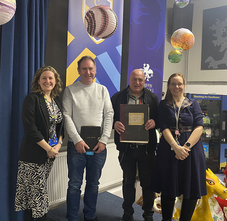 Chivenor alumni holding logbooks (centre) with current school staff / Photograph supplied by Chivenor Primary School